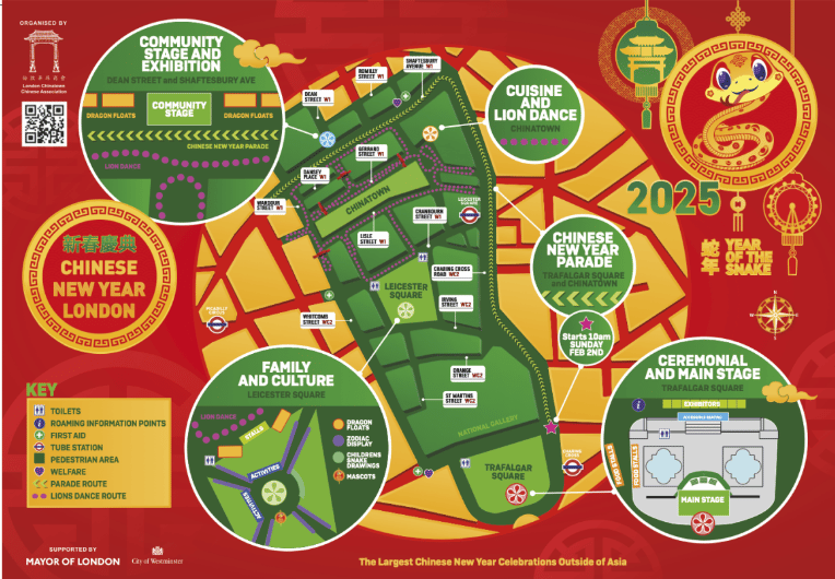 China Town / Trafalgar Square Londonās Chinatown hosts the biggest Chinese New Year celebrations outside of China, making it the place to be for festive vibes. Lion dance performances on Saturday 1st, New Year Parade on Sunday 2nd No Charge